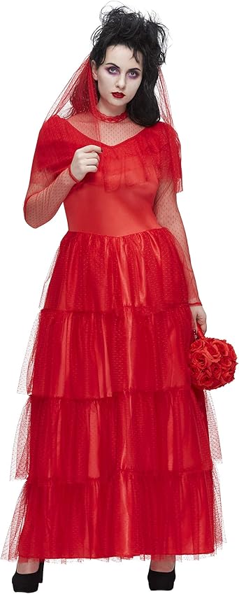 Touch device users explore by touch or with swipe. This Gothic Bride Costume Wedding Dress includes a layered red dress made of satin and interlock with lace overlays. Lydia Deetz Gothic Red Wedding Style Dress Cosplay Costume for Halloween with Headdress Made of high quality satin and mesh fabrics will last long for multiple wears.